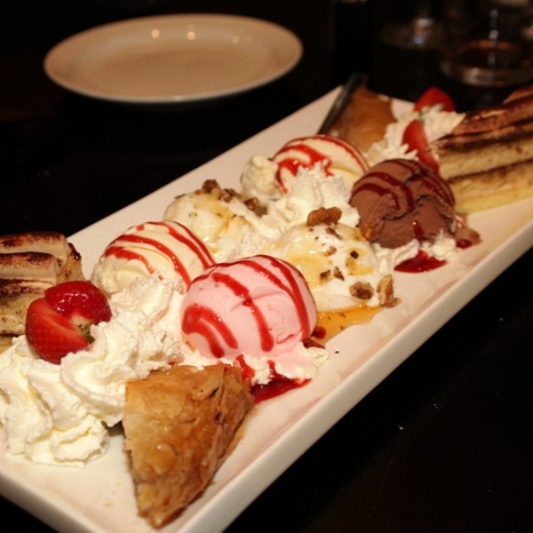 - Of een Griekse salade, gestoofde lamsschenkel en een Dame Blanche als dessert