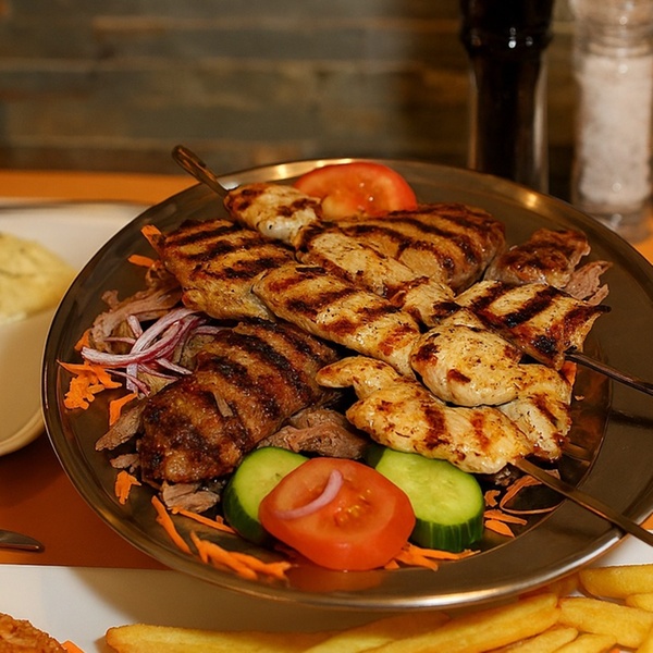- Alle hoofdgerechten worden geserveerd met frites, salade, rijst en traditionele tzatziki