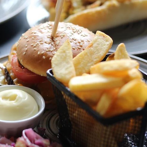 sappige burger met huisgemaakte burgersaus, gesmolten cheddar, verse tomaat, ui, augurk en knapperige ijsbergsla