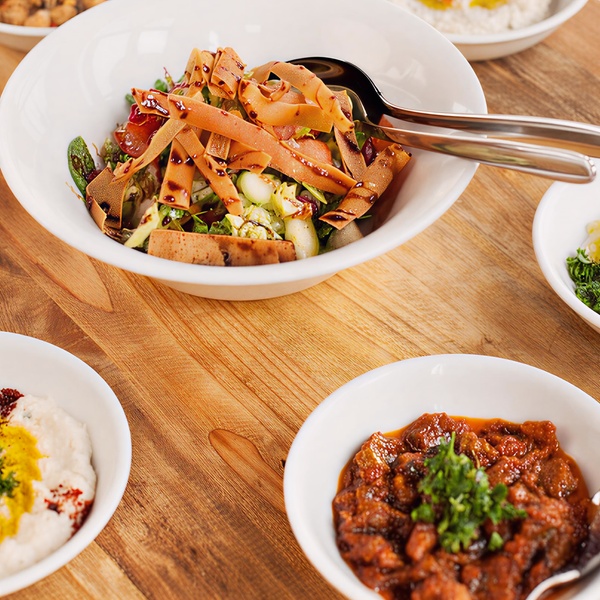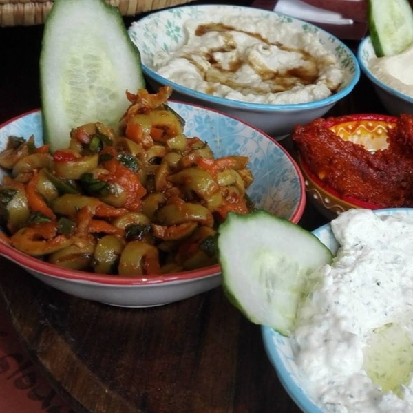 6 koude en 6 warme gerechten volgen elkaar in smaakvolle parade op, van hummus en tzatziki tot falafel en gekruid lamsgehakt.