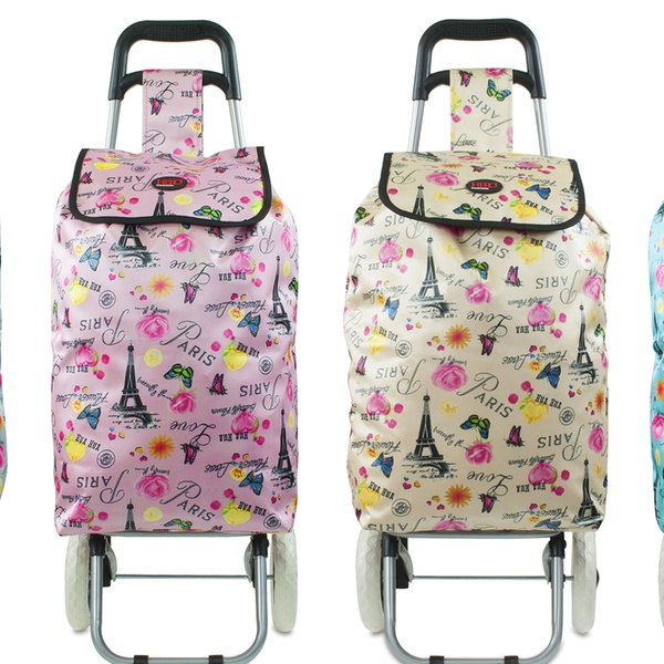 Deze bedrukte boodschappentas met 2 wielen is verkrijgbaar in vier kleuren.