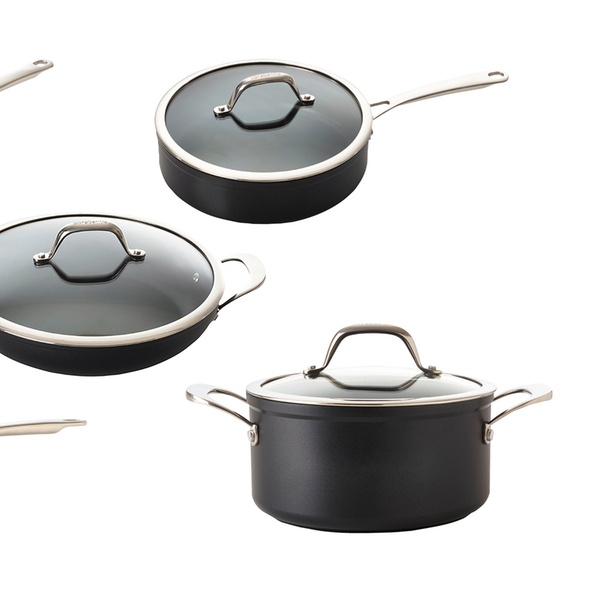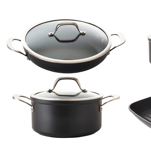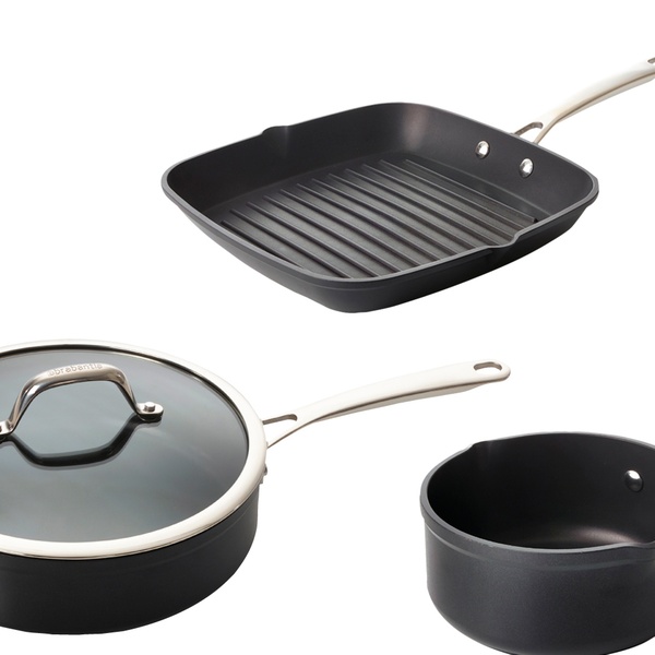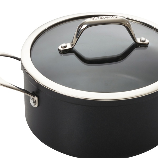 Deze Brabantia Tritanium Alux-pannen zijn gemaakt van gesmeed aluminium en hebben een drielaagse anti-aanbaklaag.