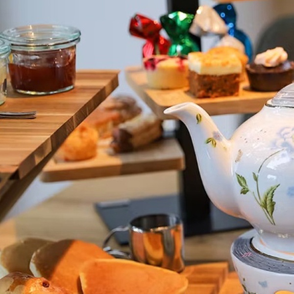 • De high tea wordt geserveerd in een speciaal Husky-servies en bestaat uit: