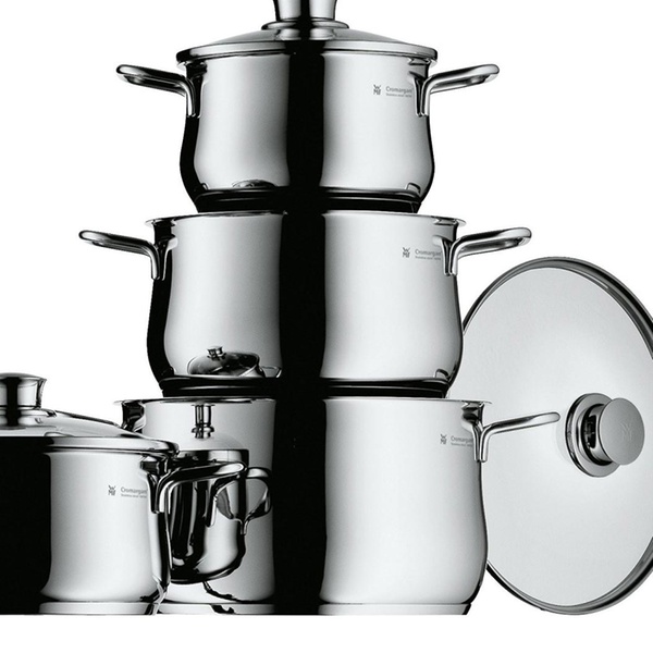 De set Diadem Plus van WMF is rond en bestaat uit 3 grote pannen met glazen deksel (24 cm - 6 L, 20 cm - 3,5 L en 16 cm - 2 L) en een sauspan met glazen deksel (20 cm - 2,5 L). 18/10 Cromargan roestvrijstaal. De magnetische Transtherm bodem past op alle fornuizen en kookplaten en zorgt voor een optimale warmteverdeling. Vaatwasserbestendig.