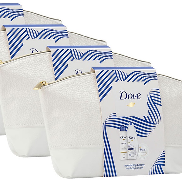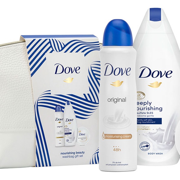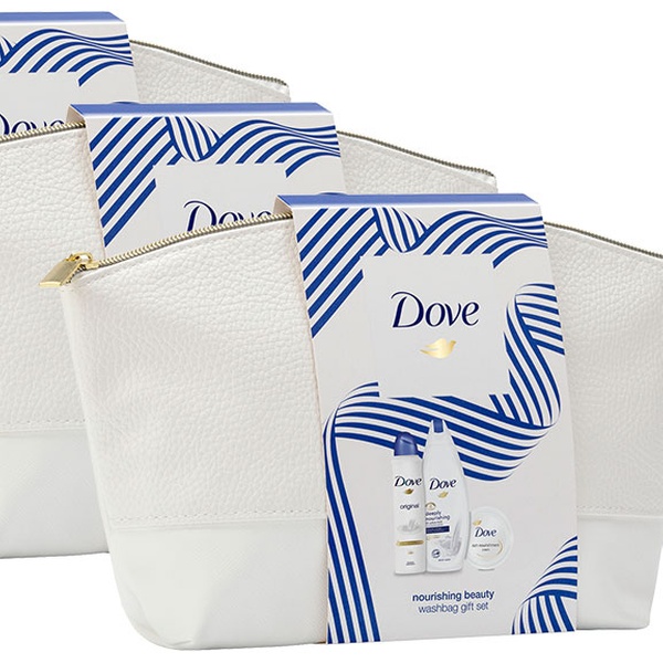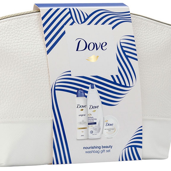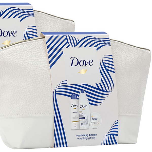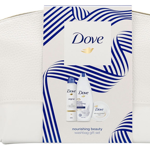 Deze set bevat Dove-producten, Dove Nourishing Shower Gel, Dove Rich Nourishment Cream Jar en Dove Original Deodorant.