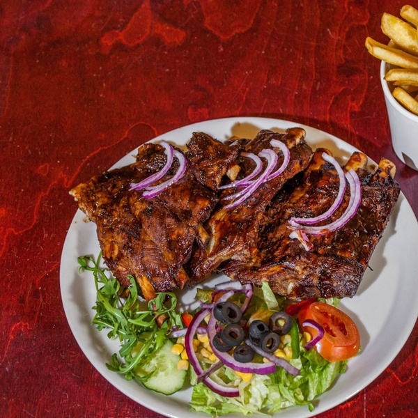 De mixed grill bestaat uit spare ribs, kipfilet en Angus steak en is dus een bord vol genieten voor de echte bourgondiër