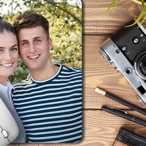 Fleur je werkplek op met een foto van bijvoorbeeld een leuk moment of je huisdier op een muismat en computer met een glimlach