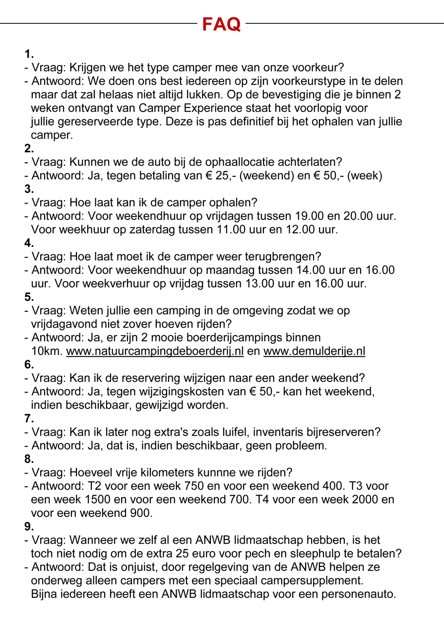 Meer info: klik hier voor veel gestelde vragen. Voorkeur voor een van de 5 campermodellen kan doorgegeven worden tijdens het boeken. Het type model zal toegewezen worden op basis van beschikbaarheid. Minimum leeftijd voor het huren van de camper is 21 jaar en je moet minstens 1 jaar in bezit zijn van een rijbewijs. Je moet de camper ophalen bij Camper Experience in Oudewater. Voor € 7 per dag met een minimum bedrag van € 50 kan het eigen risico verlaagd worden naar € 450. Extra kosten worden gefactureerd door Camper Experience na het reserveren. De borg dient minimaal 5 dagen voor vertrek voldaan te worden. Credit card is niet mogelijk. Vrije kilometers voor weekendverhuur: T2 - 400km, T3 - 700km, T4 - 900km en weekverhuur: T2 - 750km, T3 - 1500km, T4 - 2000km. Voor extra kilometers betaal je € 0,40 per kilometer voor T2 en € 0,20 voor T3 en T4. Onze Verkoopvoorwaarden en de Wettelijke Bedenktermijn gelden voor alle deals.