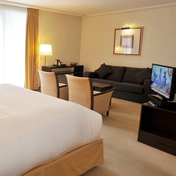 De luxe met warme kleuren ingerichte kamers beschikken over airconditioning, een breed tweepersoonsbed, bureau met een comfortabele stoel, zitje met tafel, flatscreen tv, telefoon en koffie- en theefaciliteiten. De badkamer is voorzien van een wastafel, toilet en een bad of regendouche.