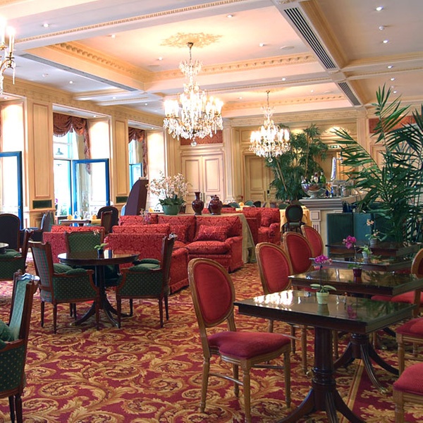 - Hotel-brasserie met glazen kroonluchters en een beschilderde koepel