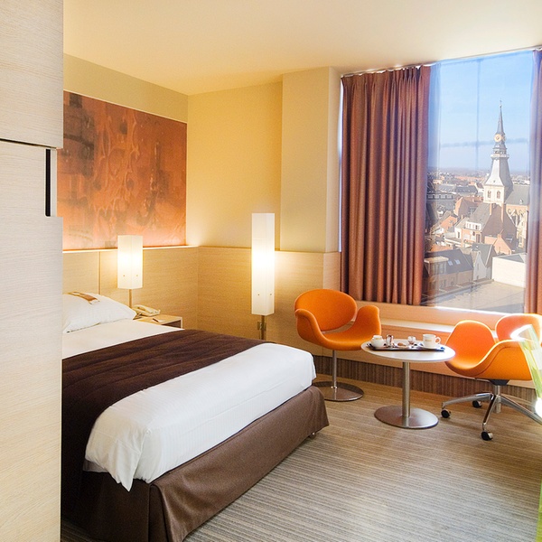 Hotel Radisson Blu Hasselt 4* is genesteld in het centrum van Hasselt. De kamers zijn ingericht met een knipoog naar de Renaissance, geïnspireerd op de meesterwerken van Jan Van Eyck. Alle kamers beschikken over airco en luxueus meubilair, een flatscreen-tv met lcd-scherm, een kluisje en een badkamer met luxe toiletartikelen. Sommige kamers bieden ook een panoramisch uitzicht over de stad. Het restaurant Koper biedt internationale en lokale specialiteiten in een chique omgeving. Het keukenteam stelt gevarieerde menu’s samen, gebaseerd op wat het Vlaamse platteland én de Noordzee te bieden hebben. Bovendien kun je terecht in de Sky Lounge (65m. hoog!) voor verse cocktails met een panoramisch uitzicht over de stad en iedere 1ste en 3de zondag van de maand wordt er een brunch geserveerd. Vanaf hotel kan je gemakkelijk de culturele bezienswaardigheden bereiken zoals het Nationaal Jenevermuseum.