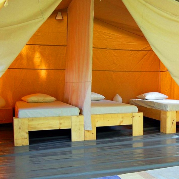 Safaritenten: De Safaritenten zijn luxe tenten die geplaatst zijn op vlonders, geschikt voor maximaal 5 (type ‘Camel’) of 6 personen (type ‘Taupe’). De Safaritenten zijn wind- en waterdicht, zijn luxueus ingericht en voorzien van alle benodigdheden zoals; volledige keukeninventaris, slaapcabines en een vlonder terras.