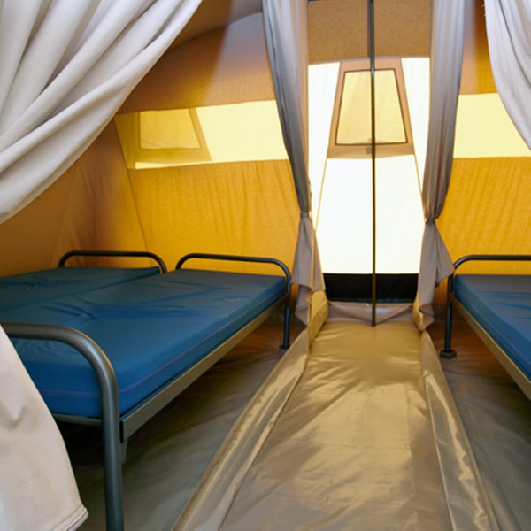 De boogtent is een grote bungalow-achtige tent met aparte leefruimte, slaapvertrekken en een ruim kookgedeelte met servies, koelkast en watertank. In de tent zijn een tafel, een opbergkast, verlichting en stroompunten aanwezig. Het slaapgedeelte bestaat uit twee slaapcabines, voorzien van in totaal vijf 1-persoonsbedden. De ingerichte tenten staan op De Shelter/ Om de Noord en Kogerstrand.