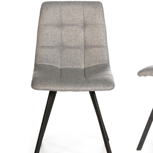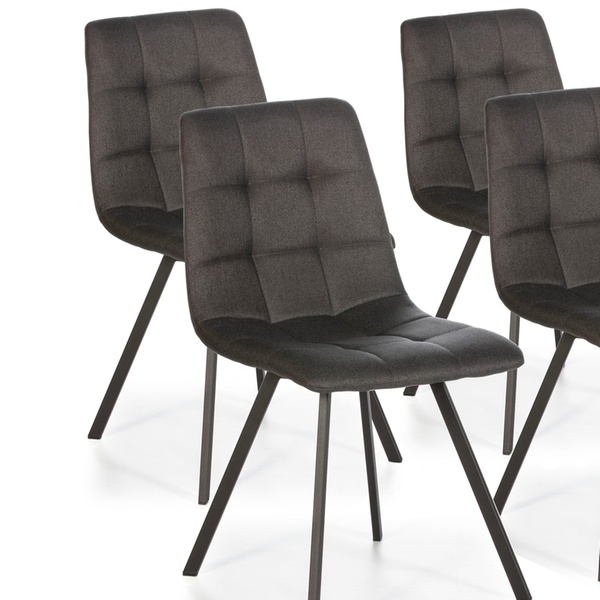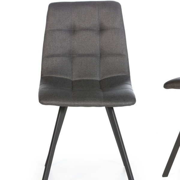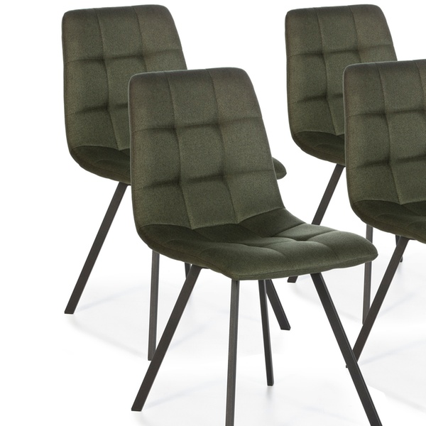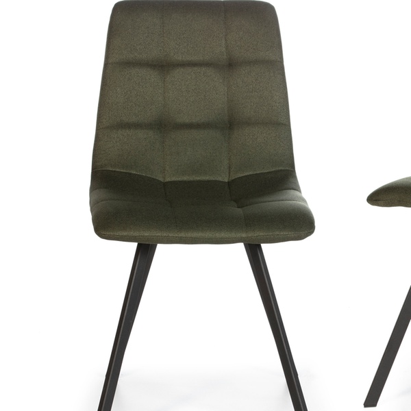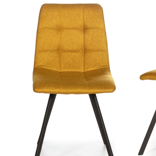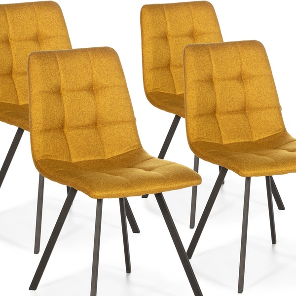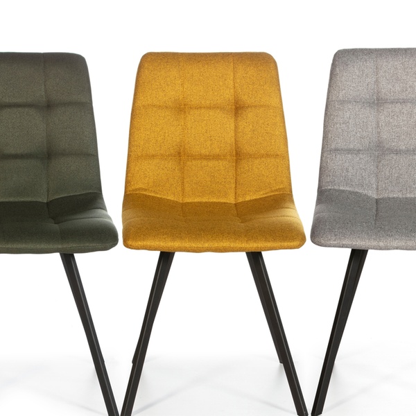 - Stoel bekleed met mosterdstof, in de kleuren groen, donkergrijs of lichtgrijs, met metalen poten afgewerkt met matzwarte elektrostatische verf