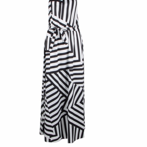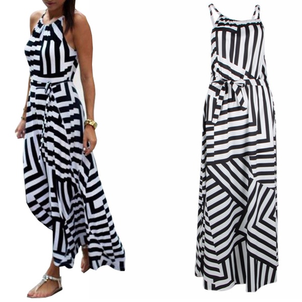 Deze Maxi-jurk met ronde hals en zonder mouwen heeft zwarte en witte strepen en past bij elk paar sandalen in de zomer.