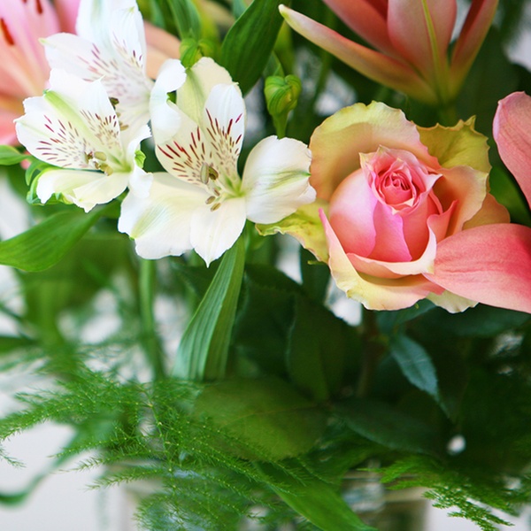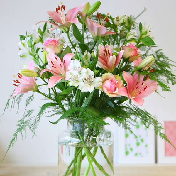 Zoeter dan dit gaat het bijna niet worden! De frisse kleur van de spierwitte Alstroemeria’s past perfect bij de babyroze Rozen en imposante Lelies.