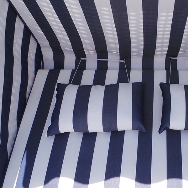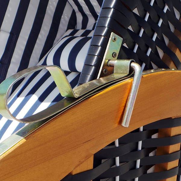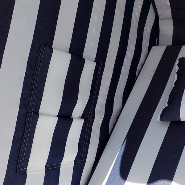 Kies uit de volgende opties voor een luxe strandstoel in het blauw en wit, in het rood, groen en beige of in het grijs en wit, van EveMotion: