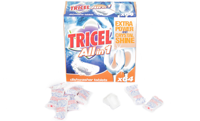 Tricel All-in-1 vaatwastabletten zijn krachtpatsers die op de eerste plaats zorgen voor een stralend schone vaat, maar ook kalkaanslag weten te voorkomen en dat is dan weer goed voor het behoud van je vaatwasmachine. Ook spoelglans is overbodig, want de vaat wordt grondig gereinigd en de actieve zuurstof zorgt voor verwijdering van hardnekkige vlekken en een mooie glans. Met een hele hoop wassen in de het vooruitzicht mag je er kiezen voor 640 of 320.
