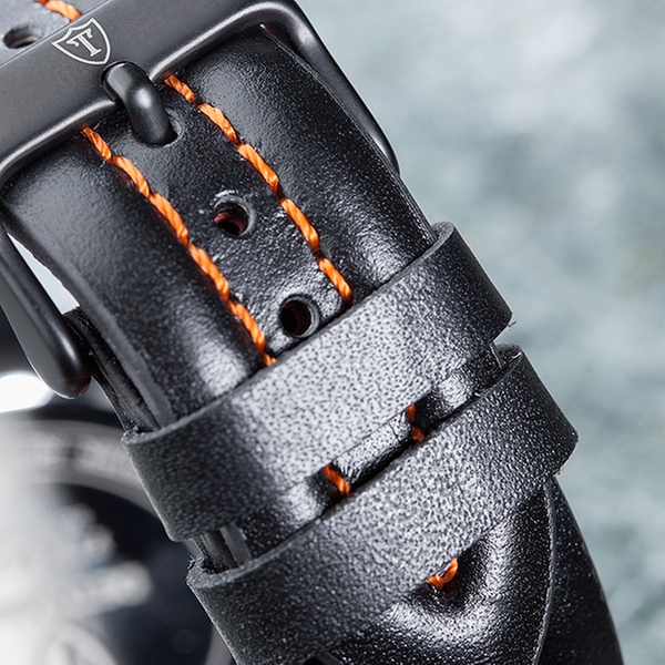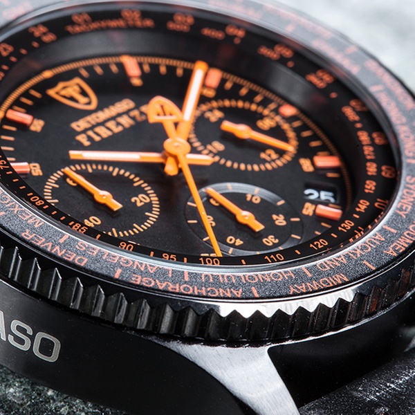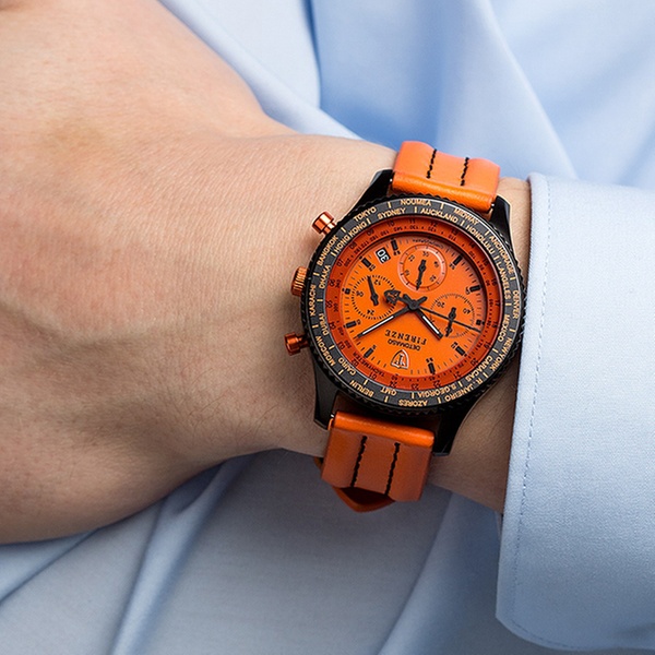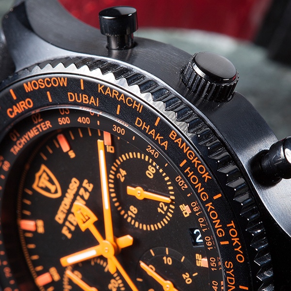 Deze lederen herenhorloges zijn voorzien van quartz uurwerk, chronograaf en draaibare bezel met tijdzones; geïnspireerd door de motorsport