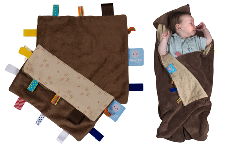 Het knuffeldoekje is 25 cm x 25 cm, heeft twaalf labels en is gemaakt van velours/coral en 100% katoenen jersey. Kindjes kunnen met de labels spelen en met de zachte materialen knuffelen.