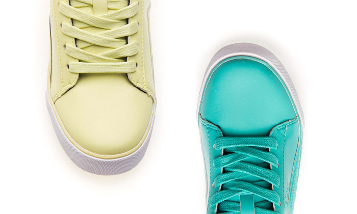 De sneakers zijn er in kleuren zwart, turquoise, lichtgroen, perzik, wit, grijs en blauw.