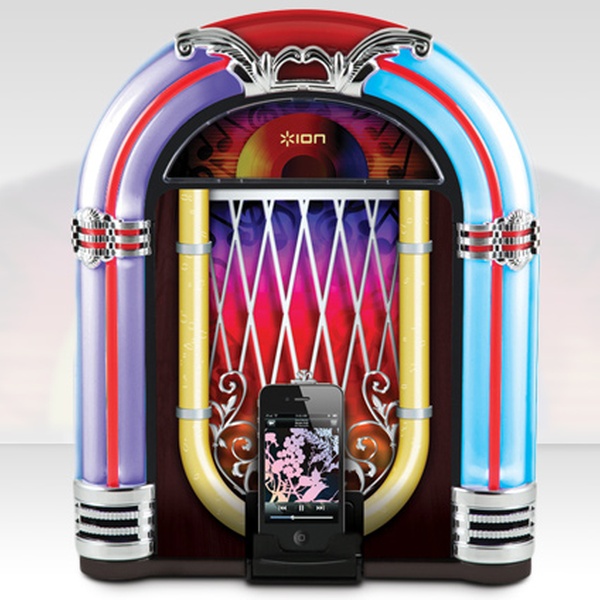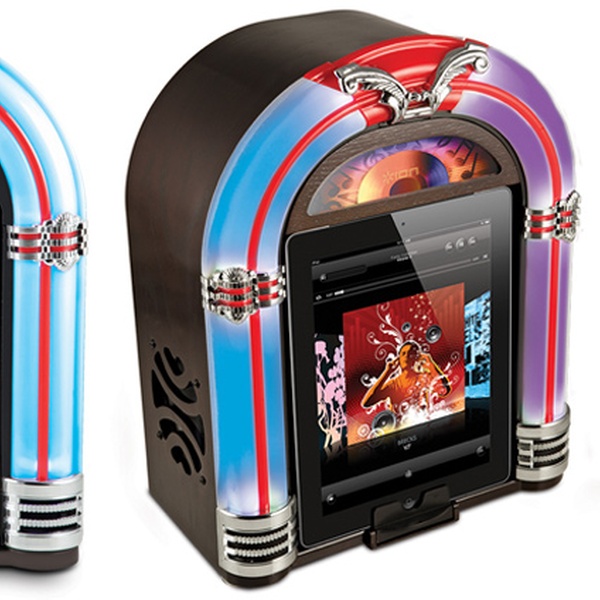 Dit universele dockingstation is te gebruiken met je iPad, iPhone of iPod. Naast dat-ie je muziek afspeelt wordt je toestel natuurlijk ook opgeladen. Het houten bedieningspaneel en de lichtgevende randen in neonstijl geven deze jukebox die klassieke ‘look en feel’. Handig ook dat-ie gewoon op iTunes werkt en compatibel is met andere jukebox-applicaties uit de App Store.