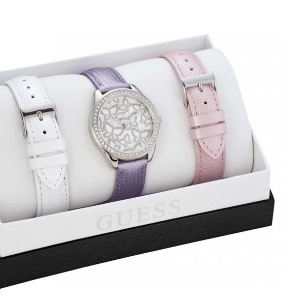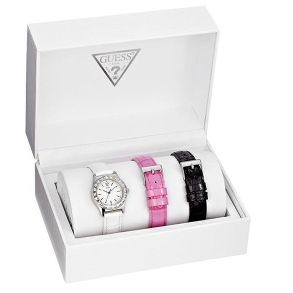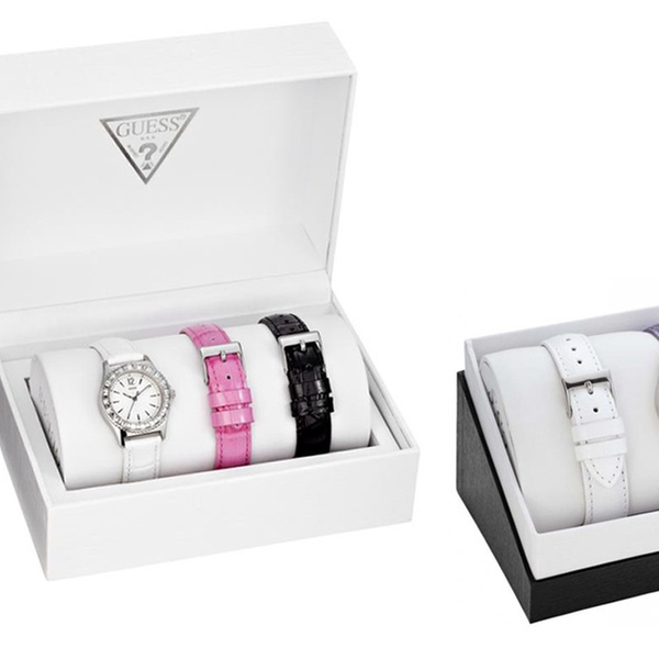 € 99,99 voor een Guess dameshorloge - wit, zwart en roze leren band (W11180L1) (44% korting)