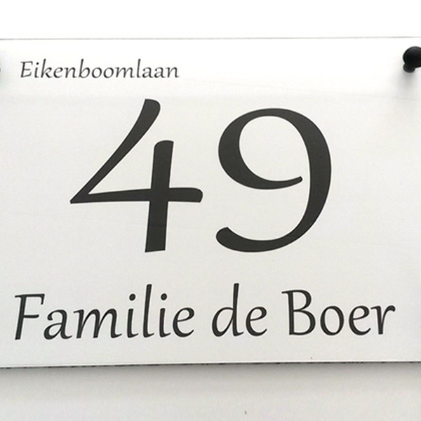 Er is niemand zo dankbaar als de visite die weet waar ze moeten aanbellen. Of de postbode die zeker weet dat dat het juiste huisnummer is. Of jijzelf die wilt laten zien dat je de trotse eigenaar bent van je eigen huis. Creëer een huiselijk gevoel met een gepersonaliseerd bord waarop je logischerwijs een huisnummer en de familienaam kan laten plaatsen. Maar je kan er ook een andere tekst op laten aanbrengen. De tekst wordt gesneden uit hoogwaardige folie en daarna vakkundig over het bord verdeeld en gecentreerd. Daarnaast bepaal je ook welke kleur en formaat het bordje wordt. Zo kies je uit de kleuren wit, zwart, rood of blauw, of RVS. En kies je uit een groot of klein bord. Een naambord wordt geleverd met een doorzichtige plastic plaat, afstandhouders en nette dopjes waardoor de schroeven aan de voorzijde niet zichtbaar zijn. Bestel het via de website van Streetsign.