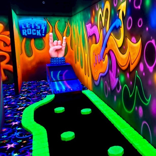 Ga de uitdaging aan met je vrienden, familie of collega’s op de glow-in-the-dark minigolfbaan vol lichtgevende decorstukken en hindernissen