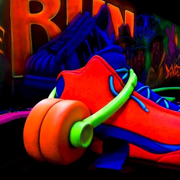 - Het fluorescerend decor heeft als thema ‘muziek’