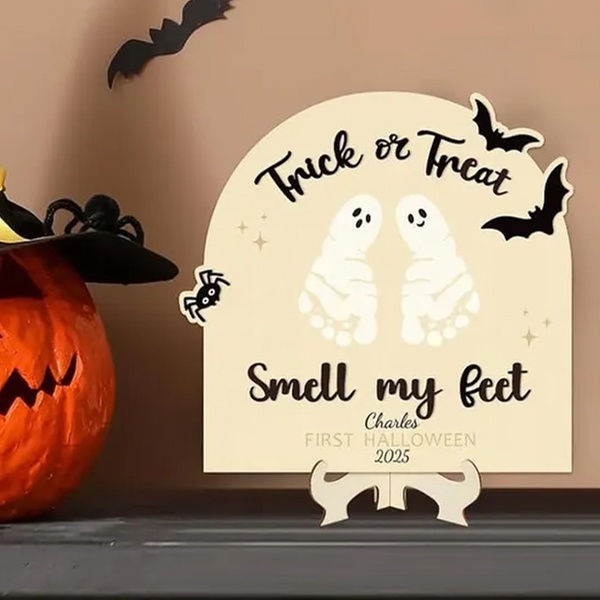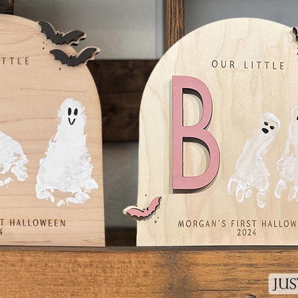 Maak Halloween extra gezellig met gepersonaliseerde houten spookjes met de naam van je familie of voetafdruk voor baby´s eerste Halloween