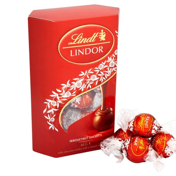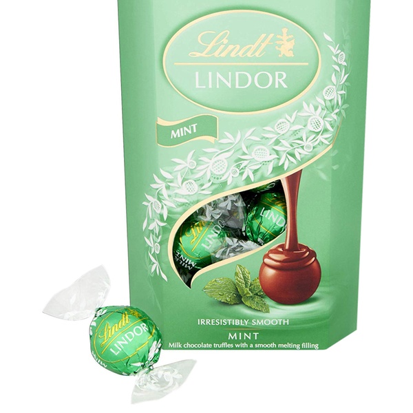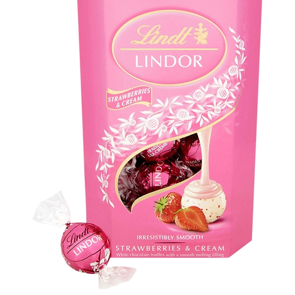 Deze Lindt Lindor-chocoladepakketten hebben de smaken aardbeien en room, melk, hazelnoottruffels en mint.