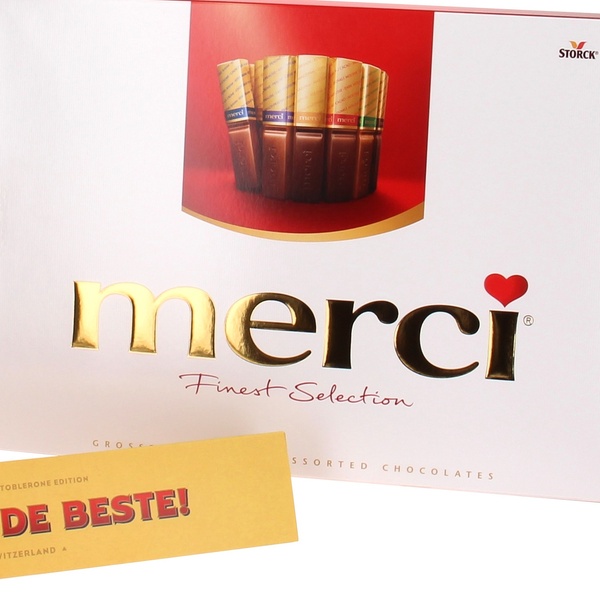 Verras je moeder - of een andere chocoladeliefhebber - met dit zoete pakket en de boodschappen “Merci” en “Je bent de beste!”.