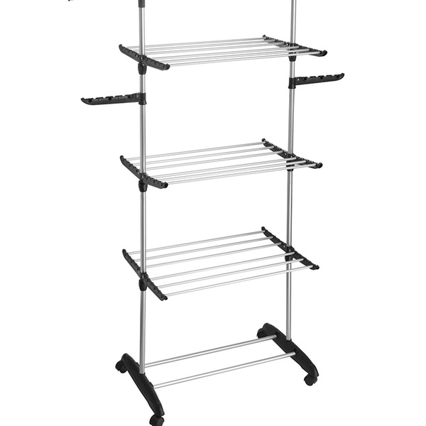 - Voorzien van 2 hangerhouders, een verlengstang voor het spreiden van lakens en ander volumineus linnengoed, een dubbele schoenenreksteun en voorzien van 4 zwenkwielen voor gemakkelijke verplaatsing en optimale stabiliteit