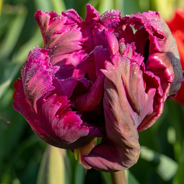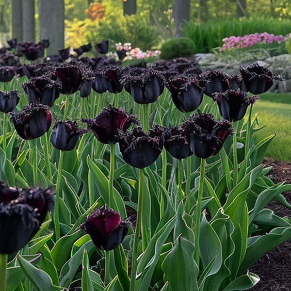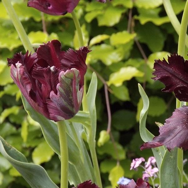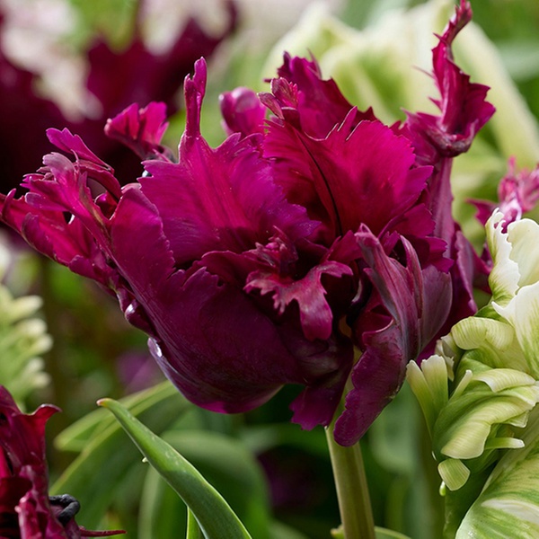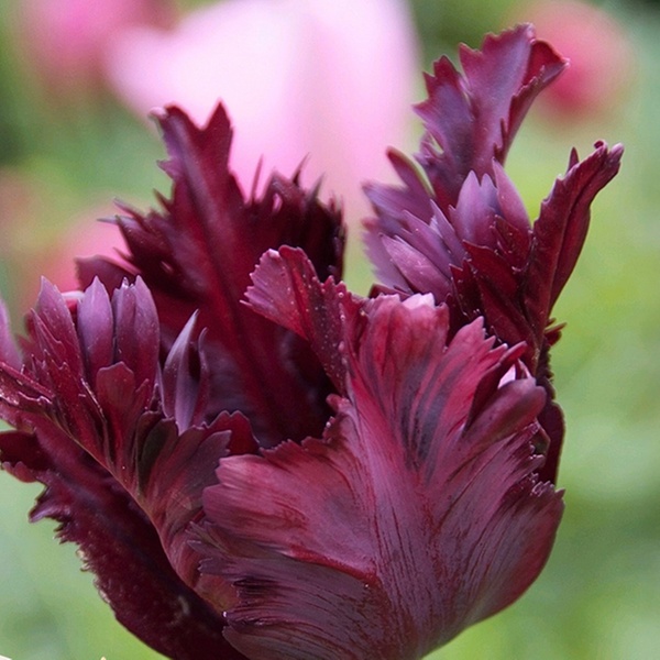 - Tulipa Black Parrot: diepe zwart-paars, elegante gerimpelde bloemblaadjes