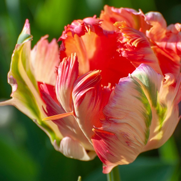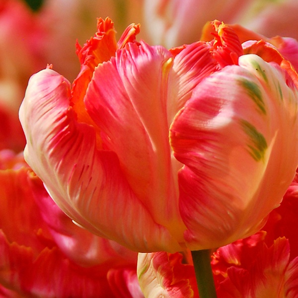 - Tulipa Rasta Parrot: fel oranje-rood-geel, gekrulde en gefranjerde bloemblaadjes