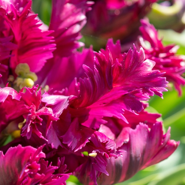 - Tulipa Parrot Negrita: diep paars met groene accenten, licht geurende bloemen