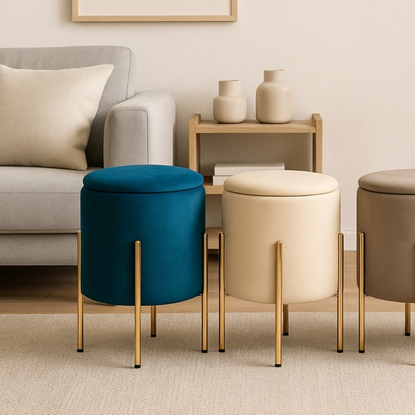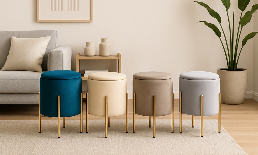 Stijlvol en multifunctioneel: een elegante poef met opbergruimte, een luxe fluwelen afwerking en gouden uitstraling