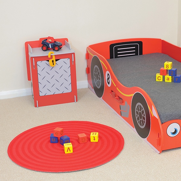 Deze kleurrijke meubelset met raceauto-thema zal de kinderkamer versieren.