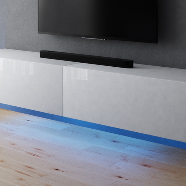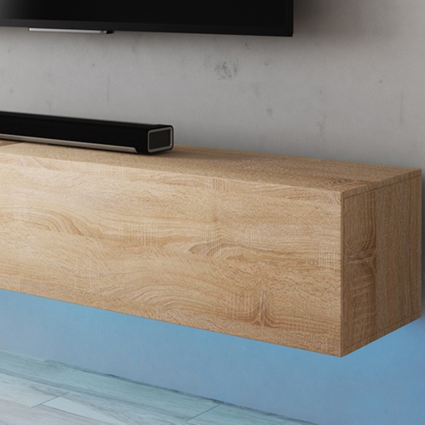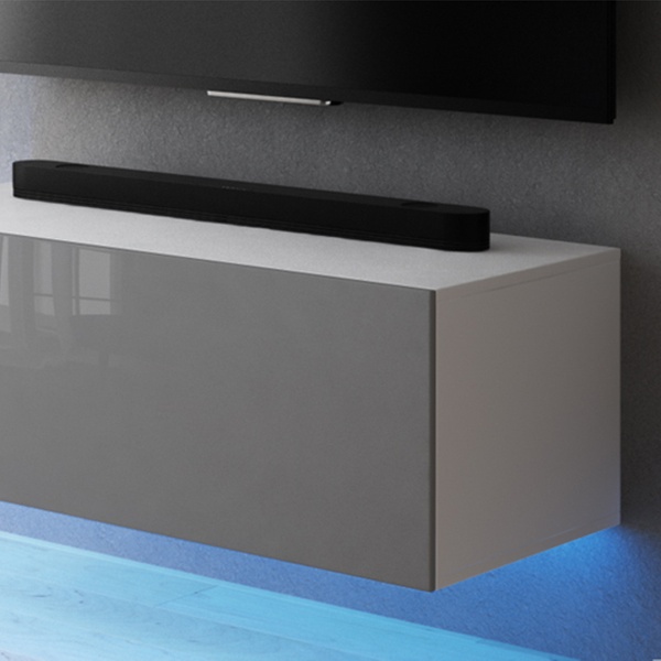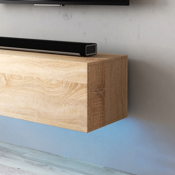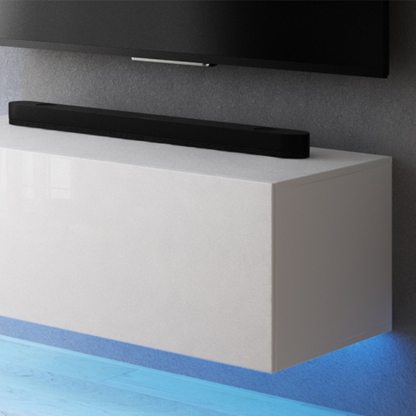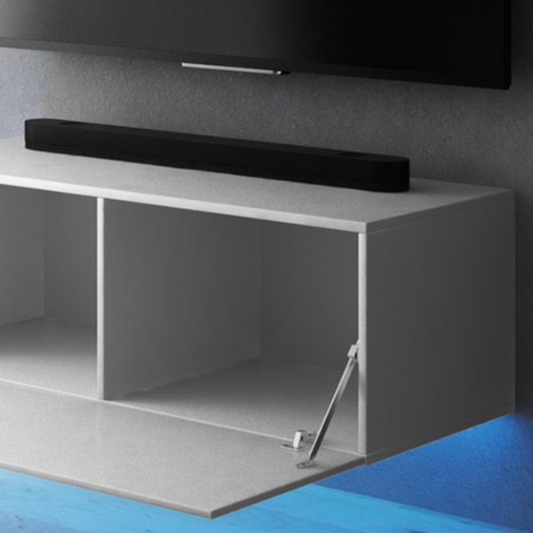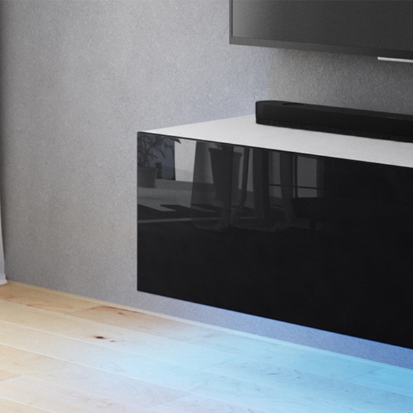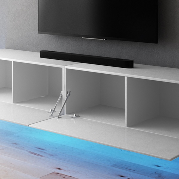 Dit hangende tv-meubel met led-verlichting is ontworpen om in elk interieur te passen en verkrijgbaar in verschillende maten en kleuren.