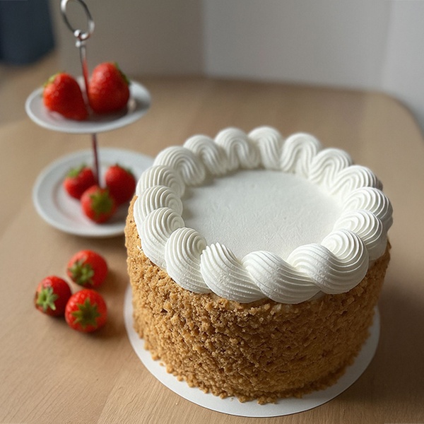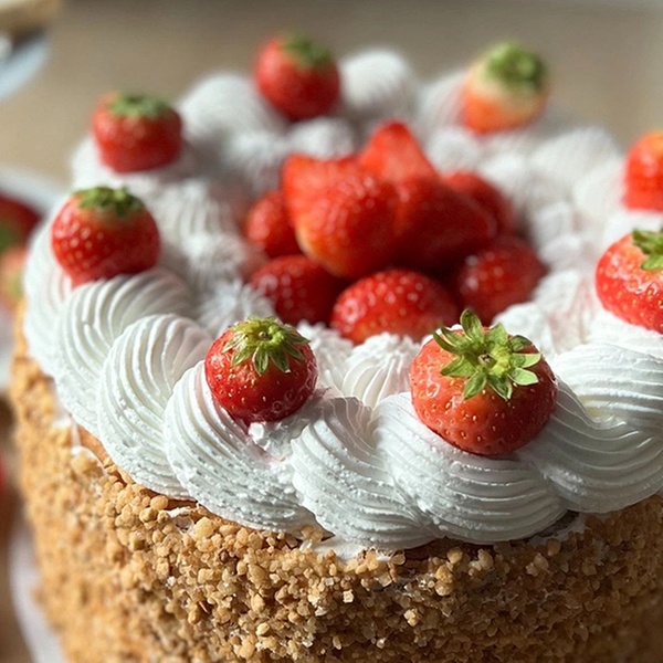 Deze taart is een echte eyecatcher voor elke gelegenheid. Op zoek naar een feestelijke traktatie die indruk maakt? De ambachtelijke slagroomtaart heeft drie lagen, luchtige vulling en een subtiele toets van aardbeienjam. Rondom afgewerkt met krokante nougatine en optioneel vers fruit.