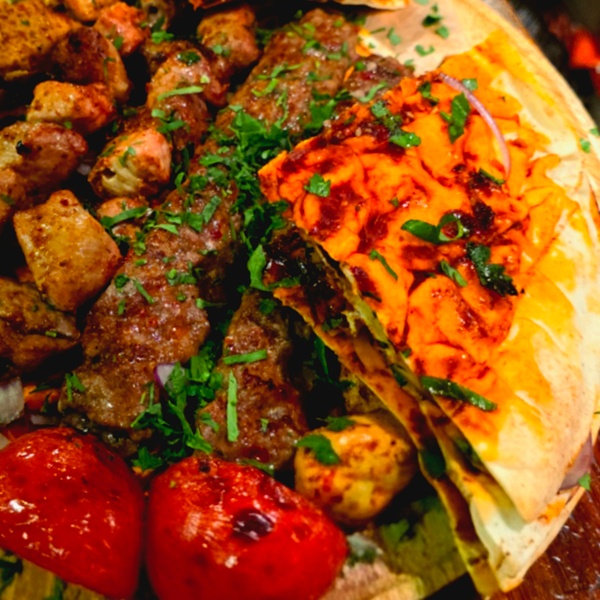 • Syrische Mixed grill (3 spiezen): spies lamsvlees gehakt, een spies met lamsvlees en een spies van kip