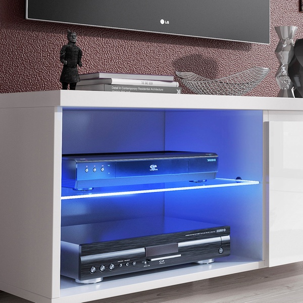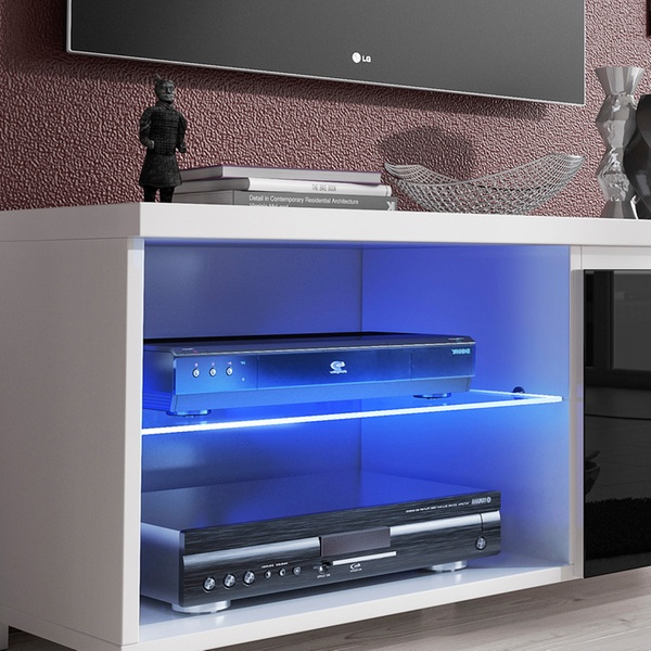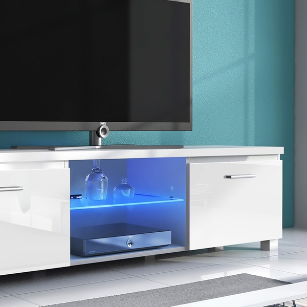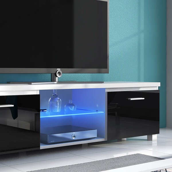 Dit TV-meubel heeft een modern ontwerp, met opbergruimte en led-verlichting.