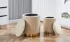 - Cilindrische poefs met fluwelen bekleding en goudkleurige metalen basis