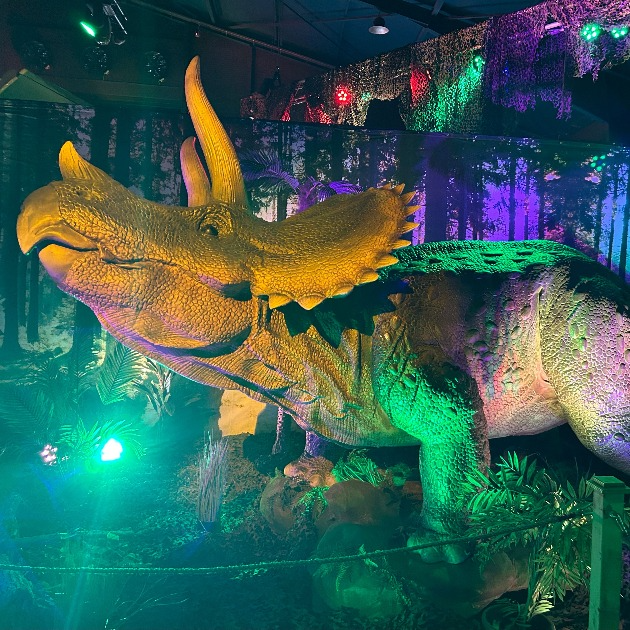 Sta oog in oog met levensgrote en bewegende dinosaurussen, waaronder een t-rex en triceratops in hun prehistorische glorie