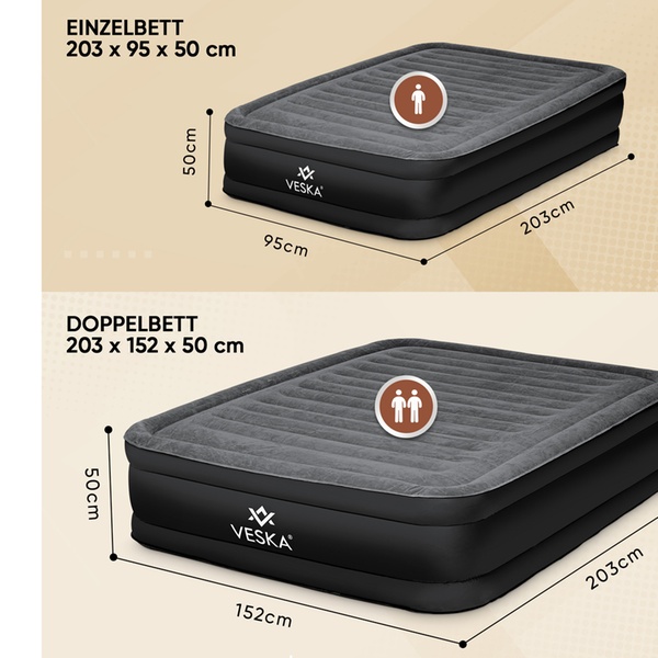 - Luchtbed, één- of tweepersoons *Afmetingen: 203 x 95 x 50 cm (eenpersoons) of 203 x 152 x 50 cm (tweepersoons)