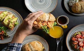 Rijkbelegde, ambachtelijke sandwiches en verse koffie op een...